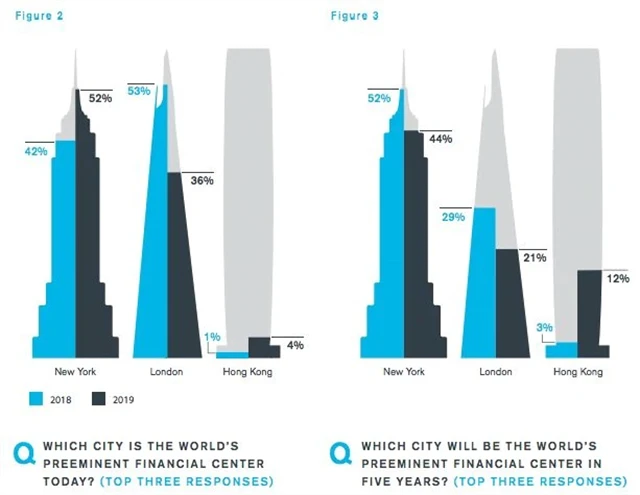 New York za hlavní světové finanční centrum označila více než polovina dotázaných, Londýn kvůli brexitové krizi zaznamenal prudký propad z loňských 53 % na 36 %.