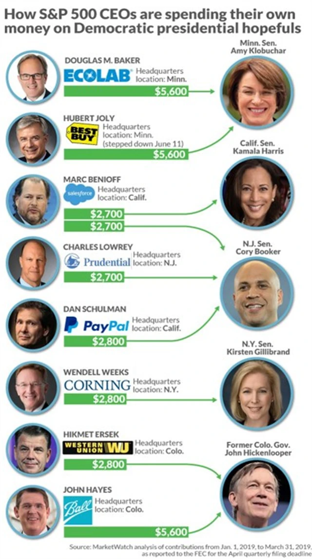 Americká volební sezóna ještě neklepe vyloženě na dveře, ale to nejdůležitější - výběr peněz na kampaň - už nabírá obrátky. Server MarketWatch.com sledoval, jak si uchazeči o prezidentskou kandidaturu za Demokratickou stranu rozdělí podporu velkých zvířat světa byznysu. Vidíme, že pěkně políčeno má senátor Cory Booker z New Jersey. Na druhou stranu šéf Salesforce.com Marc Benioff dobře dbá na to, aby co nejvíce stran příslovečného politického krajíce bylo dobře namazaných.