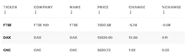 Celoevropský akciový index STOXX Europe 600 zakončil čtvrteční seanci s mírným ziskem 0,09 %. Nejúspěšnějším sektorem byly telekomunikace, nejhůře se vedlo akciím veřejných služeb. Hlavní index londýnské burzy FTSE 100 odepsal 0,08 %, německý DAX stoupl o 0,11 % a francouzský CAC 40 si polepšil o 0,03 %.