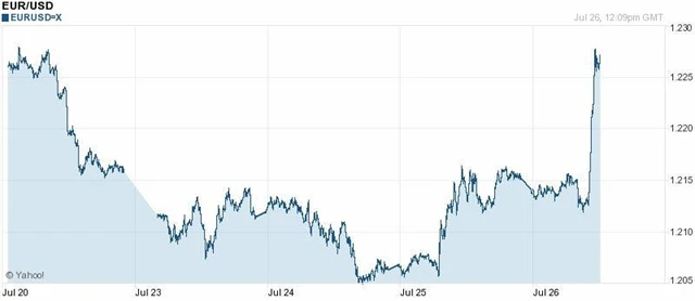 Podle Draghiho není euro ohroženo, ECB udělá "cokoli, co bude potřeba", aby eurozónu zachránila. Podle Citigroup se pravděpodobnost Grexitu zvýšila na 90 %, Itálie a Španělsko zažádají o mezinárodní pomoc do konce roku 2012. Euro ovšem reaguje na Draghiho slova prudkým posílením, výnosy 10letých španělských dluhopisů jsou zpátky pod 7 %.