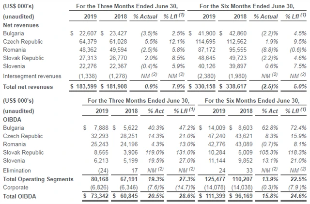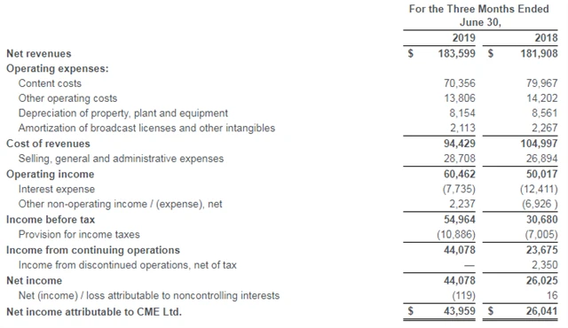 Mediální společnost CME, která v České republice vlastní televizi Nova a další stanice, vykázala za letošní druhé čtvrtletí čistý zisk 44,08 milionu USD, za druhé čtvrtletí 2018 reportovala zisk 26,03 milionu USD. Tržby se jí zvýšily ze 181,91 milionu USD na 183,60 milionu USD.