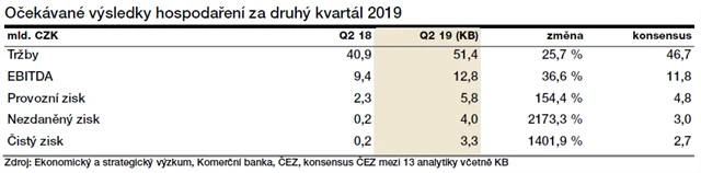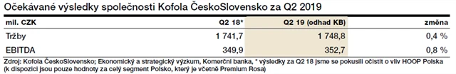 "Očekáváme relativně slabší kvartál z hlediska tržeb kvůli deštivému květnu v ČR a SR. Tržby by přesto měly růst o 2 % meziročně a 4 % bez zahrnutí vlivu počasí, tedy na 1,76 miliardy Kč. Kofola zvýšila v prvním kvartálu ceny v Adriatickém regionu a v ČR a SR ve druhém kvartálu, což tržby podpoří. Klesající ceny cukru budou kompenzovány růstem mezd a vyššími náklady na PET láhve. EBITDA marže by se proto měla mírně snížit na 18 % a zisk EBITDA by se měl pohybovat kolem 324 milionů Kč. Očekáváme snížení čistého dluhu na 2,4násobek EBITDA. Úrokové náklady by se měly meziročně zvýšit kvůli akvizicím a poměrně vysoké dividendě. Čistý zisk by měl dosáhnout 136 milionů Kč. Celkově by výsledky za 2Q2019 měly do jisté míry kompenzovat silný první kvartál, a splnění výhledu firmy pro celý rok 2019 tak bude záležet na výsledcích ve 3Q2019, který by měl být nejsilnější kvůli vrcholu sezóny," napsal Petr Bártek, analytik z České spořitelny.