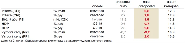 - V Evropě bude zásadní vývoj HDP v Německu, které dlouhodobě vzbuzuje obavy investorů. Červnová statistika průmyslové výroby ukázala největší propad produkce od krize. Oproti začátku roku tak ekonomika propadla o 0,1 %. Vzrůstá tak riziko, že Německo ve třetím čtvrtletí vstoupí do recese, ačkoli v základním scénáři stále předpokládáme oživení tamního průmyslu i maloobchodních tržeb. Pro celý rok 2019 tak očekáváme růst ekonomiky 0,7 %, byť s jednoznačným rizikem slabšího vývoje.