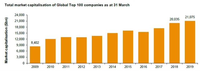 Souhrnná tržní kapitalizace stovky největších firem světa se v roce 2019 dostala na rekordní hodnotu 21 bilionů dolarů, což meziročně znamená pětiprocentní nárůst. Zároveň je to ale zpomalení proti předchozímu desetiprocentnímu růstu.