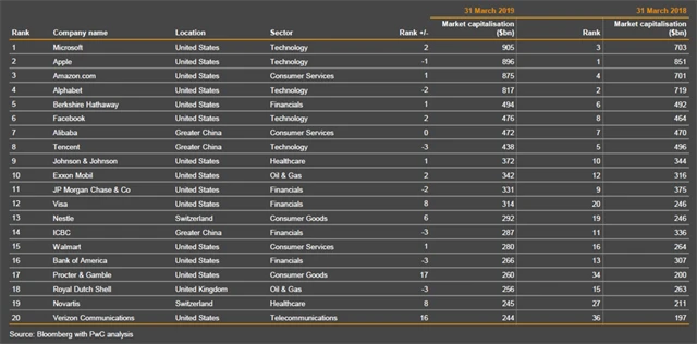 Největší firmou světa je Microsoft, který (k letošnímu 31. březnu) po sedmi letech sesadil z první pozice Apple (během jednotlivých let se na první pozici dostal také Amazon). Tržní kapitalizace Microsoftu je 905 miliard USD a Applu 896 miliard. Dominanci amerických technologických firem na čele žebříčku ještě podtrhává umístění Amazonu, Alphabetu a Facebooku v první šestce. Vklínit se mezi ně dokázala pouze na páté místo Berkshire Hathaway investora Warrena Buffetta. Vyplývá to z žebříčku PwC Global Top 100.