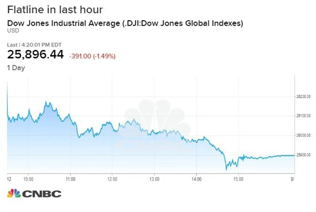 Index Dow oslabil o 1,49 % na 25 896,44 bodu, širší index S&P 500 se snížil o 1,23 % na 2 882,70 bodu a index technologického trhu Nasdaq Composite klesl o 1,2 % na 7 863,41 bodu. Index volatility VIX stoupl o 17,36 % na 21,09 bodu a výnos 10letých vládních dluhopisů USA spadl o jedenáct bazických bodů na 1,64 %, nejníže od podzimu 2016. Ceny ropy spíše mírně rostly a zlato posílilo o procento nad 1 510 USD za trojskou unci. Mírně naopak ztrácel bitcoin.