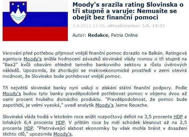 Varování před potřebou přijmout vnější finanční pomoc dorazilo na Balkán. Ratingová agentura Moody's snížila hodnocení závazků slovinské vlády rovnou o tři stupně na "Baa2" kvůli obavám ohledně tamního bankovního sektoru a růstu úvěrových nákladů. Upozornila, že zhoršující se makroekonomické prostředí v zemi otevírá možnost, že Slovinsko bude potřebovat vnější pomoc.