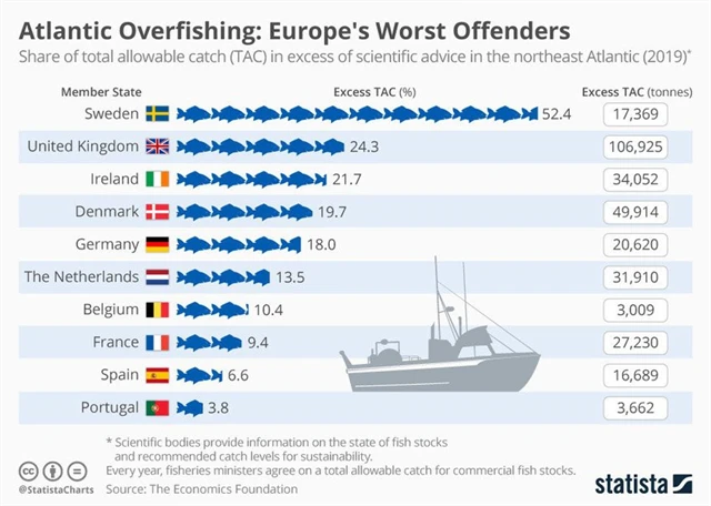 Zpráva New Economics Foundation řadí země podle toho, nakolik překračují celkový přípustný odlov (TAC) komerčních zásob ryb. Ze zprávy vyplývá, že jednoznačným evropským "lídrem" pro rok 2019 je v tomto směru Švédsko, které překračuje TAC o více než 50 %. Výrazně ale toto omezení překračuje třeba i Spojené království.