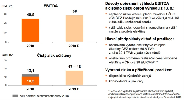 "Výsledky hospodaření za třetí čtvrtletí jsou na první pohled pod odhady trhu. Negativní byly v třetím kvartálu výroba v tradičních, tzn. uhelných a jaderných elektrárnách a vratka 1,3 miliardy Kč SŽDC za objednanou, ale neodebranou elektřinu. Tržby ve výši 48,03 miliardy Kč jsou lehce pod konsenzem 49,2 miliardy Kč. Také zisk EBITDA ve výši 9,8 miliardy Kč zaostal za odhadem trhu na úrovni 11,5 miliardy Kč a pod konsenzem byl i čistý zisk ve výši 0,2 miliardy Kč. Důvodem zpřesnění výhledu pro celý rok je zmíněná vratka 1,3 miliardy Kč. Zveřejněná čísla za devět měsíců roku představují 75,8-78,4 % celoročního cíle u EBITDA a 77,4-86,5 % u celoročního cíle čistého zisku. Na první pohled vypadají čísla negativně, celoroční cíle se nicméně prakticky nezměnily, a stále tak naznačují vyšší dividendu než loni. I tak ale očekáváme spíše negativní reakci trhu," říká analytik Miroslav Frayer z Komerční banky.