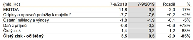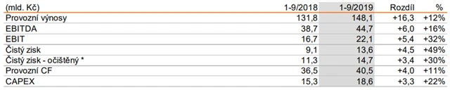 Tržby za samotné třetí čtvrtletí dosáhly 48,03 miliardy Kč (3Q2018: 45,52 miliardy Kč) a provozní zisk EBITDA činil 9,8 miliardy Kč (3Q2018: 11,8 miliardy Kč). Čistý zisk se skupině v třetím čtvrtletí snížil o 88 % na 0,2 miliardy Kč a očištěný čistý zisk spadl o 85 % na 0,5 miliardy Kč.