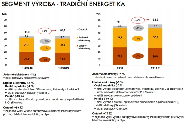 "Společnosti pomáhá pokračující růst cen elektřiny a fakt, že se v každém dalším čtvrtletí budoucí dodávka energie prodává za vyšší ceny. Meziroční zhoršení je naopak podstatné v objemech vyrobené elektřiny. V jaderných elektrárnách klesl v třetím čtvrtletí o procento v důsledku delší odstávky v Dukovanech, v uhelných elektrárnách se snížil o 5 %. Pozitivní je nárůst výroby v paroplynu o 80 %," uvedl analytik Capitalinked Radim Dohnal.