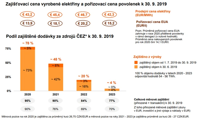 ČEZ standardně pokračuje v zajišťování tržeb z výroby ve střednědobém horizontu. Na rok 2020 měl na konci září předprodáno přibližně 78 % očekávané výroby za 43,20 EUR/MWh, na rok 2021 zhruba 48 % za 45,40 EUR/MWh, na rok 2022 asi 20 % za 46,70 EUR/MWh a na rok 2023 asi 4 % za 42,30 EUR/MWh.