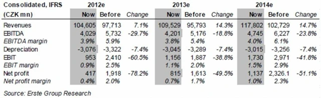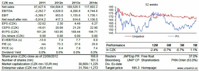 Očekáváme, že čistý zisk společnosti letos dosáhne 417 milionů Kč a v příštím roce 815 milionů Kč. Na základě svých odhadů si myslíme, že se Unipetrol obchoduje ve srovnání s regionální konkurencí s prémií, kterou vzhledem k nízké komplexnosti a neurčité střednědobé strategii považujeme za neobhajitelnou. Podle našich odhadů se firma obchoduje na očekávaném P/E 2012 73 a očekávaném P/E 2013 38.