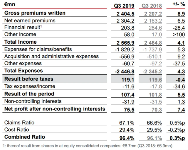 Za samotné třetí čtvrtletí VIG vykázala hrubé předepsané pojistné 2,40 miliardy eur (meziročně +8,9 %), zisk před zdaněním 119,1 milionu eur (meziročně -0,4 %) a čistý zisk 75,5 milionu eur (meziročně +7,4 %). Kombinovaný poměr se meziročně zvýšil o 0,3 procentního bodu na 96,4 %.