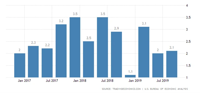 USA - mezikvartální anualizovaný růst HDP (v %)