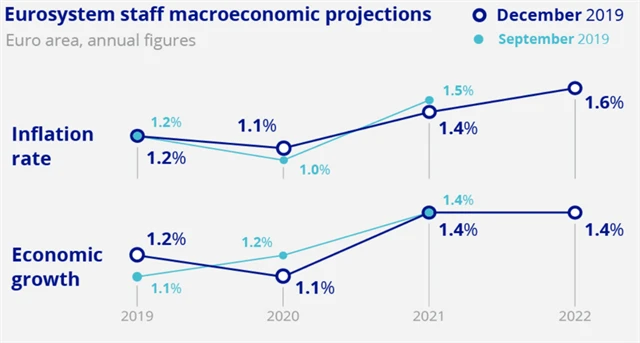 V nové prognóze centrální banka eurozóny proti výhledu ze září zhoršila odhad růstu HDP v příštím roce. Letos by se měl produkt podle ECB zvýšit o 1,2 % (zářijová prognóza: +1,1 %) a v roce 2020 by měl stoupnout o 1,1 % (zářijová prognóza: +1,2 %). Výhled pro rok 2021 banka ponechala na 1,4 %. V roce 2022 by pak ekonomika měla vzrůst rovněž o 1,4 %.