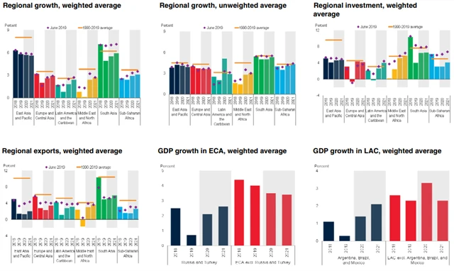V jednotlivých vyspělých i rozvojových zemích bude situace různá. V USA, eurozóně a Japonsku čeká Světová banka mírné zpomalení růstu kvůli slabšímu zpracovatelskému sektoru a přetrvávajícím vlivům amerických cel a odvetných kroků. V rozvíjejících se zemích má ovšem růst ožít, i když má být slabší, než odhadovala banka loni v červnu.