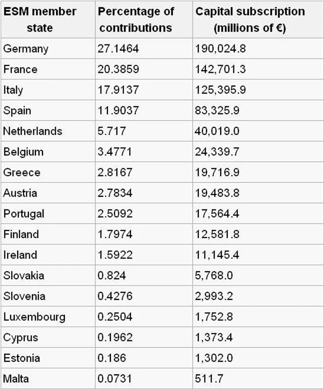 Tabulka ukazuje, kolik jednotlivé státy garantují peněz z celkové palebné síly ESM 700 miliard eur. Reálně do něj ovšem vloží ve stejném poměru pouze 80 miliard eur.