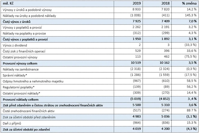 Běžná ziskovost (ziskovost očištěná o jednorázové vlivy) vzrostla o 13,4 %, zejména díky rostoucím provozním výnosům a řízení nákladů. Úspěšné dokončení strategie prodejů historického portfolia úvěrů v selhání (NPL) přineslo v roce 2019 zisk 358 milionů korun před zdaněním. Celková nominální hodnota prodaných NPL činila 3,2 miliardy Kč. Očištěné náklady na riziko dosáhly i díky pozitivnímu dopadu prodejů NPL portfolia úrovně 57 bazických bodů (v roce 2018 to bylo 72 bazických bodů).