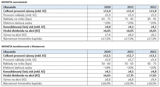 Na základě výsledků dosažených v roce 2019 představenstvo upravilo své odhady a výhled. Aktuálně čeká za samotnou Monetu růst výnosů na minimálně 11,8 miliardy Kč a čistého zisku na nejméně 4,2 miliardy Kč do roku 2022. V kombinaci s českými dceřinými firmami Wüstenrotu očekává růst výnosů na minimálně 13,1 miliardy Kč a čistého zisku na nejméně 4,8 miliardy Kč do roku 2022. Dividenda by se měla do roku 2022 zvýšit až na minimálně 9,40 Kč na akcii.