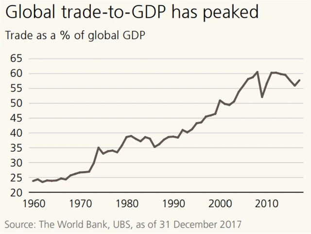 Globalizace dosáhla svého vrcholu v uplynulé dekádě a nyní je patrné, že digitalizace a preference lokální výroby mohou stát za jejím zpomalováním, stejně jako napětí mezi USA a Čínou.
