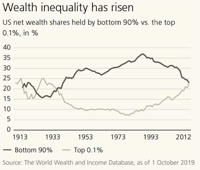 Zaměstnaní lidé se stále méně podílejí na ekonomické produkci. V USA se poprvé od 30. let 20. století vyrovnalo bohatství horních 0,1 % se jměním 90 % "nejchudších". Důvody jsou mimo jiné nižší sazby daně z příjmů právnických osob, automatizace, rozvoj globálních dodavatelských řetězců a rychlý růst největších firem.
