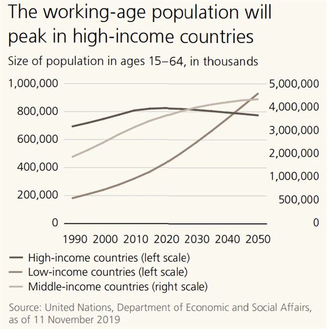 To bude tlačit na nižší tempo růstu HDP a bude to vyvolávat otázky týkající se vládního financování. Současně bude v mnoha rozvíjejících se zemích pokračovat rychlý růst populace, což by mělo podporovat tamní ekonomiky. Země, které těží z "demografické dividendy", například Indie, by se měly snažit vytvořit dostatečný počet pracovních míst, aby zmírnily riziko sociálních nepokojů nebo zhoršení globálních migračních problémů. Celkově by demografické změny mohly vést u spotřebitelů k růstu preferencí udržitelných produktů. Generace mileniálů, která se zajímá o udržitelnost více než generace předešlé, se v nové dekádě stane nejvíce vydělávající skupinou na světě.