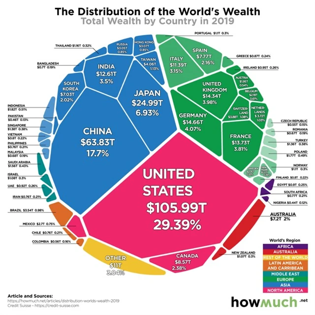 Zatímco hodnota majetku ovládaného samotnými USA dosahuje 106 bilionů dolarů, asijské země dohromady ovládají majetek v hodnotě 141 bilionů dolarů (39 %). Africké země kontrolují asi 1,14 % bohatství a země Latinské Ameriky kolem 2,75 % globálního bohatství definovaného jako hodnota všech finančních aktiv po odečtení dluhů.