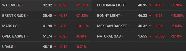 Cena ropy WTI klesla přechodně na 30 USD za barel, a byla tak nejnižší od února 2016. "Saúdská Arábie zahajuje strategii spálené země, pokud jde o problém s chronickou nadprodukcí ropy," uvedl John Kilduff z Again Capital. "Saúdové těží při jasně nejnižších nákladech, mají tak výhodu proti ostatním, zejména proti americkým těžařům z břidlic."