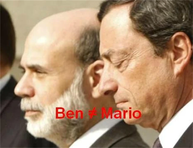 Obě centrální banky chtějí využít svou nafukovací bilanci k podpoře ekonomiky. ECB navíc slibuje, že každý nákup bude kompenzovat (financovat) prodejem něčeho jiného ze svého "portfolia". Ovšem zatímco Fed plánuje svými nákupy ovlivnit tržní prostředí a "donutit" investory nakupovat rizikovější aktiva, než jsou americké státní dluhopisy, zvýšit tím bohatství lidí a přimět je k větší spotřebě, Draghiho (ne zcela jednotná) družina chce svou akcí vyvolat větší poptávku po dluhopisech zemí, které - být firmami - neseženou úvěr v žádné rozumné bance.