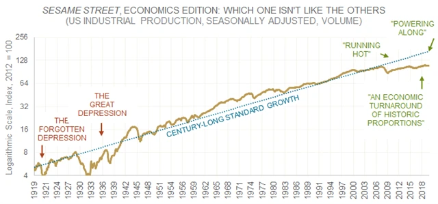 Jak ukazuje přiložený graf, limitujícím faktorem je aktuálně v USA hlavně průmysl. Od roku 2007 se index průmyslové výroby ve Spojených státech zvýšil o 4,1 %. Avšak nikoli ročně, celkově za 12 let. To je skutečně málo, a současná situace v průmyslu je z hlediska jeho výkonnosti vztažené k dlouhodobému trendu dokonce velice podobná začátku 30. let 20. století, tedy době Velké hospodářské krize.