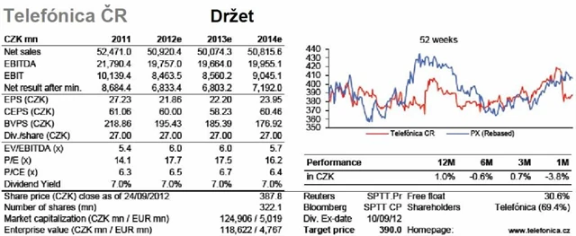 Vzhledem k poklesu odhadů hospodaření Erste Group snižuje roční cílovou cenu z 410 na 390 Kč s doporučením držet. Snížení odhadů vychází především z plánovaného snižování cen za ukončení hovorů a horšího než očekávaného vývoje v segmentu pevných linek. Krátkodobým katalyzátorem je výplata speciální dividendy 13 Kč na akcii letos v listopadu. Jelikož se jedná o přímé rozdělení z vlastního kapitálu, nebude výplata podléhat zdanění. Cenu akcií by měl podpořit i pokračující program výkupu vlastních akcií.