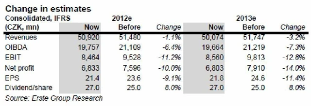 Erste Group Research snižuje odhady zisku na akcii o 10 % (pro rok 2012) a 12,7 % (pro rok 2013), především kvůli nižším odhadům tržeb v ČR (snížení cen za ukončení hovorů - avšak s dopadem do EBITDA jen menším než 1 % - a horší než dříve očekávaný vývoj segmentů pevných a datových linek, kde to bylo způsobeno výrazným konkurenčním bojem s kabelovými a wi-fi operátory).