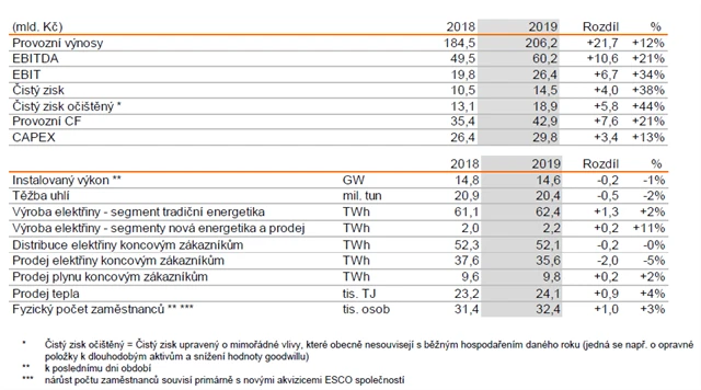 Provozní výnosy dosáhly 206,2 miliardy Kč (meziročně +21,7 miliardy Kč). Výroba elektřiny dosáhla 64,6 TWh, meziročně o 2 % více. V bezemisních jaderných zdrojích se v roce 2019 podařilo vyrobit 30,2 TWh, meziročně o 0,3 TWh více. V paroplynové elektrárně Počerady vzrostla díky vysoce příznivým tržním podmínkám výroba více než dvojnásobně a dosáhla rekordních 3,7 TWh.