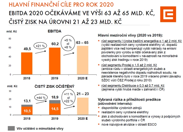 Pro rok 2020 firma očekává očištěný čistý zisk 21-23 miliard Kč a EBITDA 63-65 miliard Kč. "Výhled je v souladu s konsenzem na trhu na úrovni zisku EBITDA a asi 4 % pod odhady, pokud jde o čistý zisk. Zdá se být opatrný v segmentu tradiční výroby elektřiny, lepší výsledky firma očekává v prodeji koncovým zákazníkům a distribuci," napsal Petr Bártek, analytik z České spořitelny, k výsledkové zprávě ČEZ.