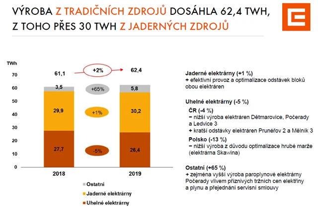 V oblasti tradiční výroby byly podniknuty přípravné kroky pro odstavení vybraných uhelných zdrojů a pro naplnění nových ekologických limitů po roce 2020. I v reakci na zásadní odklon Evropské unie od uhlí nevyužil ČEZ opci na odstoupení od prodeje hnědouhelné elektrárny Počerady. Budoucí směřování ČEZ ilustruje fakt, že průměrné měrné emise CO2 z vyrobené elektřiny ve zdrojích ČEZ klesly za poslední tři roky o 20 %. Hodnota 361 g CO2/kWh v roce 2019 je téměř na úrovni nových paroplynových zdrojů.