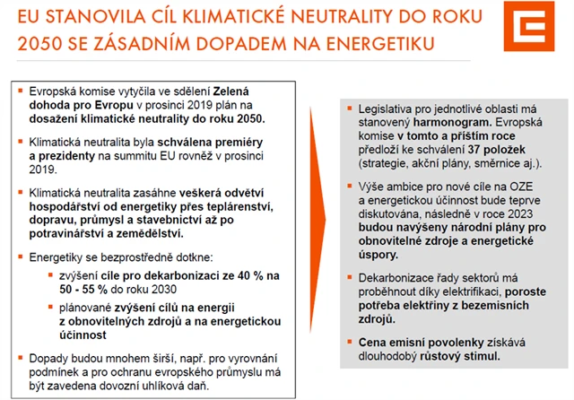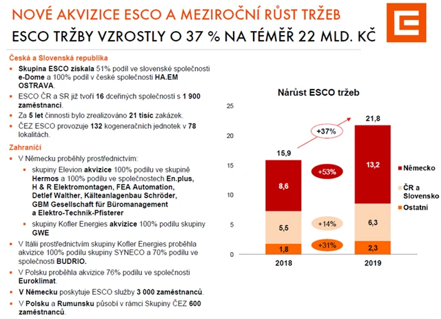 V prosinci Evropská komise vytyčila takzvanou Zelenou dohodu pro Evropu, která zásadně ovlivní energetiku, zejména zvýšením cíle pro dekarbonizaci ze 40 % na 50-55 % do roku 2030. V souladu s trendy evropské energetiky již v červnu aktualizoval ČEZ strategii a koncepci podnikatelské činnosti. Geograficky míří rozvojová strategie primárně na český trh, v zahraničí je zaměřena především na rozvoj segmentu moderních energetických služeb. Již v roce 2019 získal ČEZ nové ESCO společnosti, jejichž roční zisk EBITDA přesahuje 0,6 miliardy Kč. Pro rok 2020 ČEZ vyhlíží růst tržeb z ESCO z necelých 22 na bezmála 26 miliard Kč.