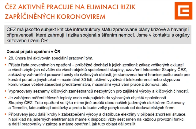 V souvislosti s aktuální pandemií koronaviru společnost ČEZ začala s přijímáním ochranných opatření s výrazným předstihem. Již koncem února aktivovalo vedení společnosti speciální tým, který průběžně přijímá opatření, aby zachoval funkčnost firmy a minimalizoval dopady.