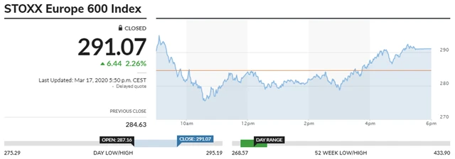 Investoři pozitivně přijali odhodlání vlád bojovat s dopady koronaviru na ekonomiku. Francouzská vláda oznámila balík opatření v objemu 45 miliard eur, Španělsko uvedlo, že poskytne na boj s dopady koronaviru 200 miliard eur, Spojené království podpoří ekonomiku vládou krytými úvěry v objemu 330 miliard liber a Bílý dům odpoledne představil dokonce balík opatření v hodnotě 850 miliard dolarů. Britský ministr financí Rishi Sunak uvedl, že vláda "udělá cokoli, co bude třeba", čímž parafrázoval slavný projev Maria Draghiho z doby dluhové krize v Evropě.