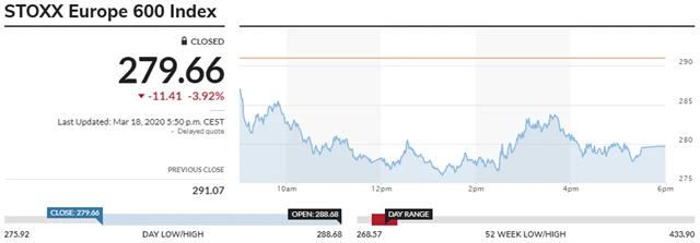 STOXX Europe 600 - 18. března 2020, zdroj: MarketWatch