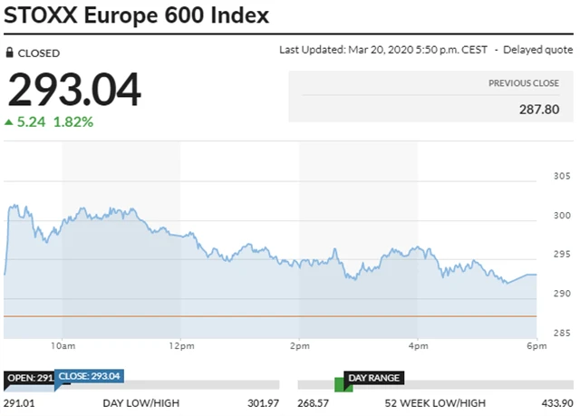 STOXX Europe 600 - týden do 20. 3. 2020, zdroj: MarketWatch