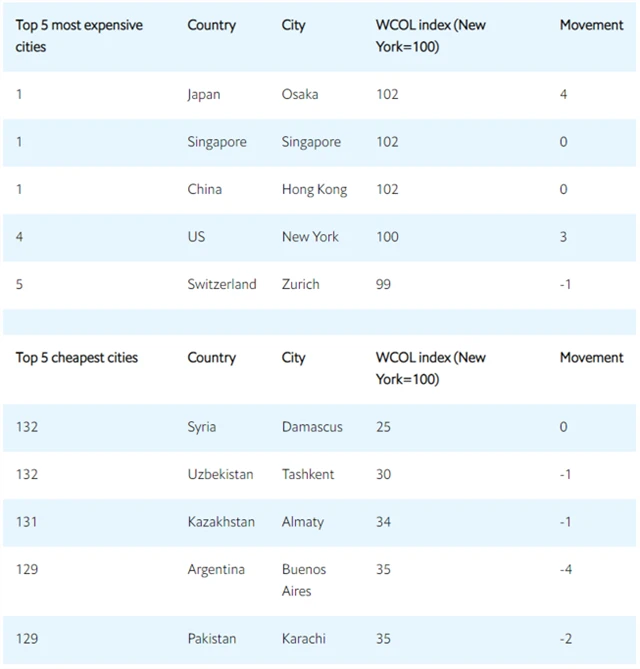 O první příčku mezi nejdražšími městy pro život se i letos mezi sebou dělí tři metropole. Stejně jako loni ji "uhájily" Singapur a Hongkong, nově se k nim ale připojilo další asijské město, japonská Ósaka, která tak nahradila Paříž. Francouzská metropole se propadla o čtyři příčky na páté místo, kromě Ósaky ji předstihl i New York, americké město si proti loňsku posunulo o čtyři příčky.