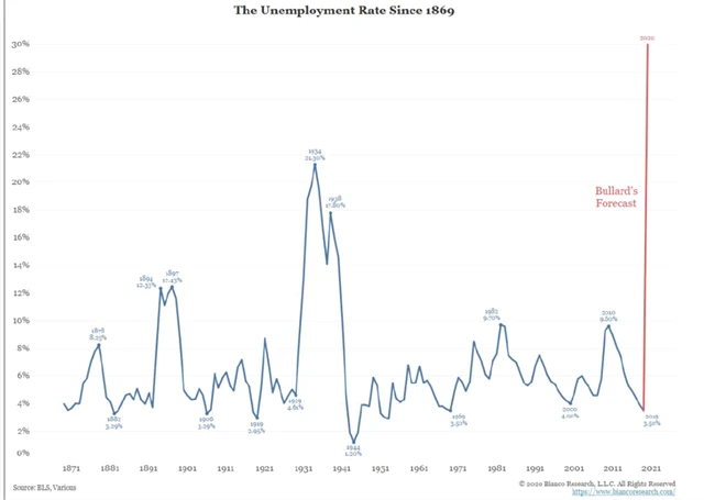 Šéf saintlouiského Fedu James Bullard se nechal slyšet, že míra nezaměstnanosti v USA se může dost až na 30 %. Bez plánu návratu lidí do práce po odeznění pandemie může dojít k sociálním nepokojům.