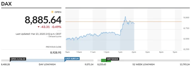 Mezi investory i v pondělí převážily obavy z ekonomických dopadů šíření koronaviru na ekonomiku nad optimismem centrálních vlád a bank proti těmto dopadům za každou cenu bojovat. Po oznámení neomezeného QE americké centrální banky sice indexy velkou část indexů smazaly, den ale zakončily poblíž denních minim.