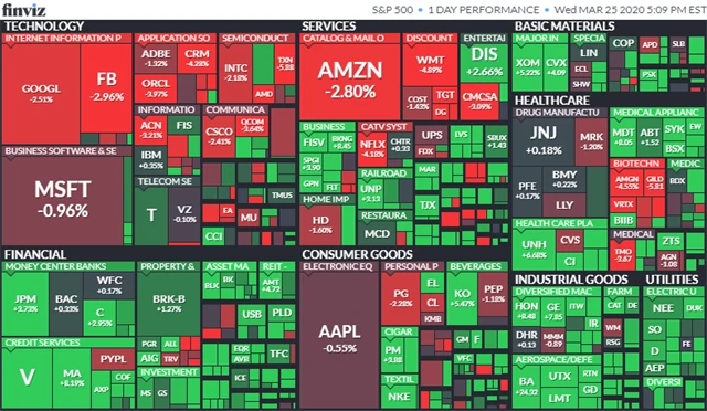 Futures na index Dow kolem 14.10 SEČ rostly o 0,51 %, futures na index S&P 500 se ale snižovaly o 0,62 % a futures na Nasdaq Composite klesaly o 0,69 %. Investoři pozitivně přijali zprávu, že se vyjednavači obou stran v americkém Senátu a Bílého domu dohodli na zákonu o masivních ekonomických stimulech, které mají zmírnit dopad šíření koronaviru na hospodářství. Proti této zprávě ale působil rychlý růst počtu nakažených koronavirem ve Spojených státech.