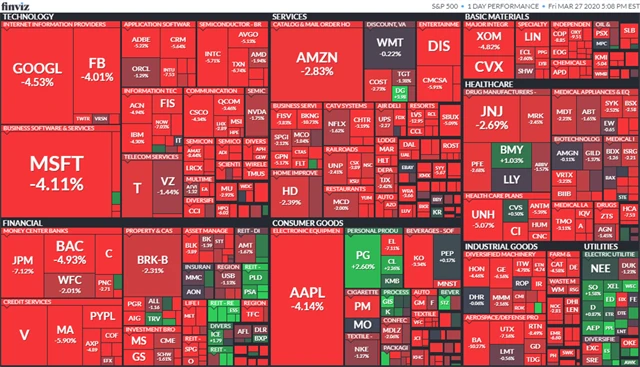 Americké akcie v pátek po předchozím vysokém třídenním růstu oslabily. Znovu se objevily obavy o další osud americké ekonomiky. Část ztrát se podařilo smazat poté, co Sněmovna reprezentantů schválila rekordní balík na pomoc ekonomice postižené pandemií nemoci COVID-19. Za celý týden však všechny tři hlavní indexy prudce vzrostly, Dow nejvíce od června 1938.