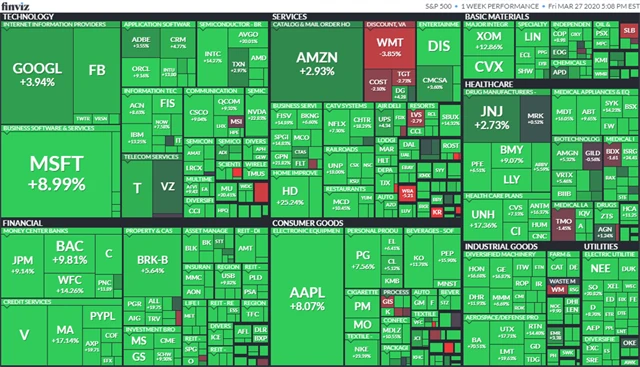 Za celý týden Dow stoupl o 12,84 %, S&P 500 vzrostl 10,21 % a Nasdaq Composite posílil o 9,03 %. Pro S&P 500 a Nasdaq Composite to byl nejvyšší růst od března 2009 a pro Dow od června 1938.