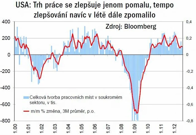 Americký pracovní trh se po překvapivě silném růstu v prvním kvartálu v těch dalších dvou zlepšoval o poznání pomaleji. Tříměsíční průměrné tempo růstu se dokonce dostalo na nejnižší úroveň od druhého čtvrtletí 2010. Ačkoli se nové žádosti o podporu v nezaměstnanosti drží setrvale pod 400 tisíci (což jekonzistentní s růstem ekonomiky), tvorba pracovních míst je s ohledem na hloubku předchozího propadu pomalá a vzhledem k trvající nejistotě pramenící z EMU není výrazné urychlení oživování na trhu práce v nejbližších kvartálech pravděpodobné.