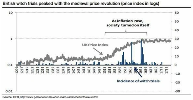 Méně známý případ, na kterém Grice demonstruje dopady inflace, je perioda ve Velké Británii na přelomu 16. a 17. století, kdy v zemi zuřily čarodějnické procesy.