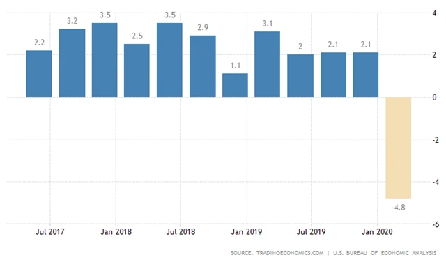 Americká ekonomika v prvním čtvrtletí zaznamenala kvůli dopadům koronaviru nejhlubší propad od globální finanční krize před více než deseti lety. Hrubý domácí produkt USA se v přepočtu na celý rok snížil o 4,8 %, zatímco v posledním čtvrtletí loňského roku ekonomika vzrostla anualizovaně o 2,1 %. Oznámilo to ve středu americké ministerstvo obchodu. Výsledek je horší, než čekali analytici, ti v anketě agentury Reuters předpovídali za první čtvrtletí propad HDP o 4 %.